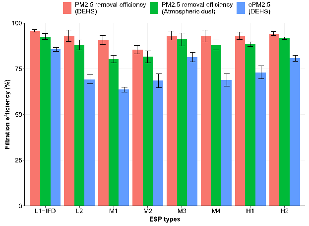 图7.使用不同气溶胶(DEHS和大气尘)测量的PM2.5收集效率和ePM2.5