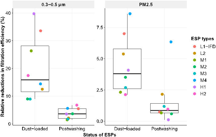 Fig.12.Relative reductions in the efficiency of removal of 0.3-0.5μm particles and PM2.5