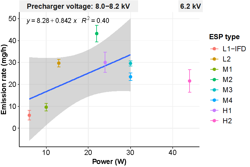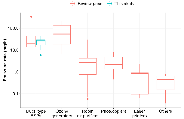 图9. 本研究中测量的管道型ESPs的OER以及与文献综述中介绍的IOED(室内臭氧释放装置)的比较