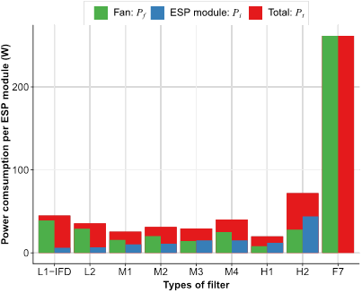 图4.在额定风量下运行的ESPs的每单位模块的总功耗(Pt)、通风系统风机功耗(Pf)和设备自身功耗(Pi)