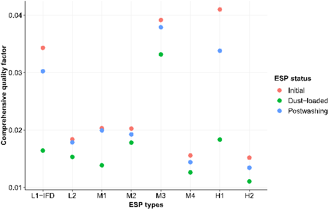 图13.三种状态下(初始、容尘后和清洗后)ESPs在2.5m/s面风速下0.3-0.5μm颗粒的CQF变化(综合质量因数)