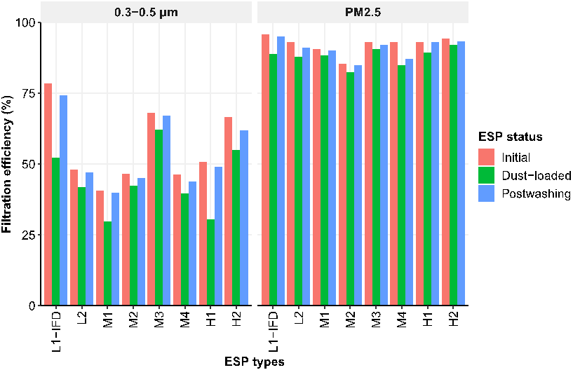 Fig.10.Filtration efficiency variations for 0.3-0.5μm particles and PM2.5 for ESPs under three