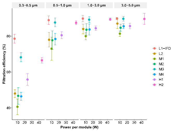 图5. 额定风量下不同粒径段(>0.3μm)的颗粒物初始效率
