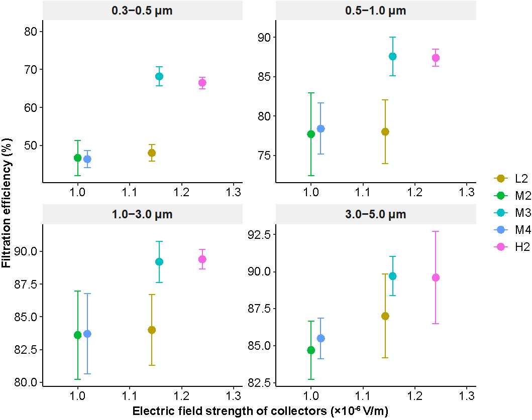 Fig.6.The filtration efficiencies of L2, M2-M4 and H2 increase with the electric field strength