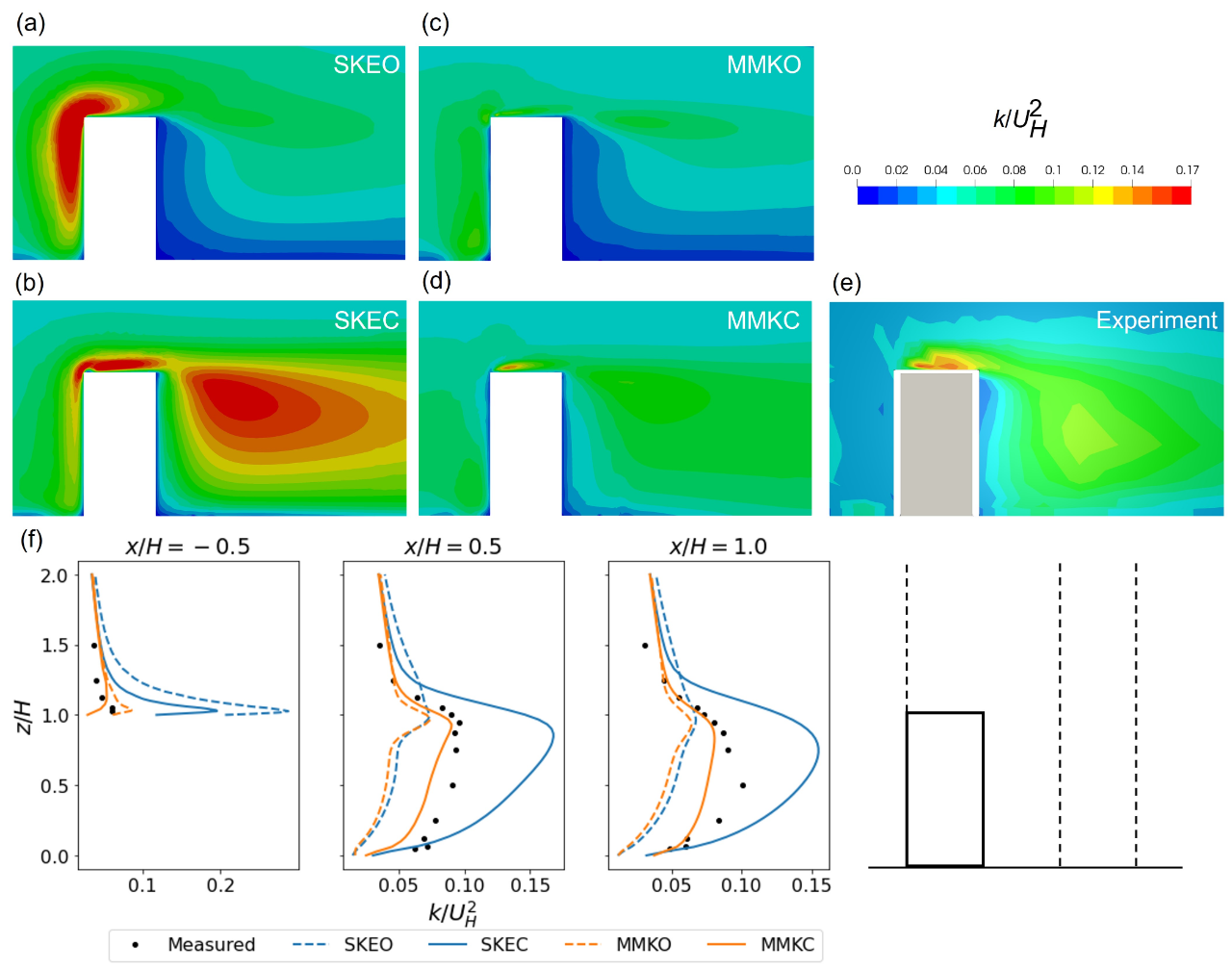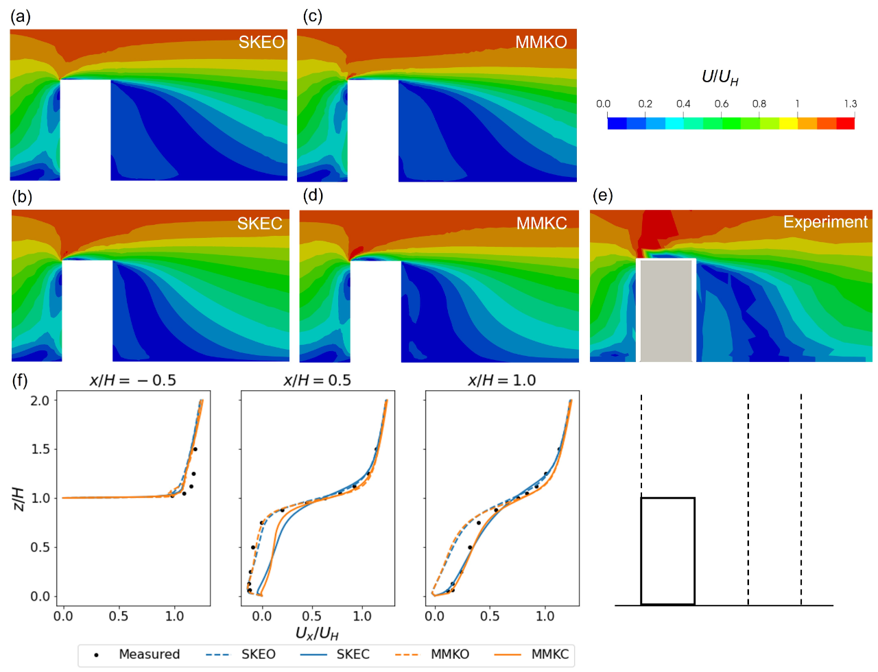 (e) determined experimentally (remade from the database [52]), and (f) vertical profiles of normalized streamwise velocity, in the vertical plane y = 0 for test case I (1:1:2 building model).