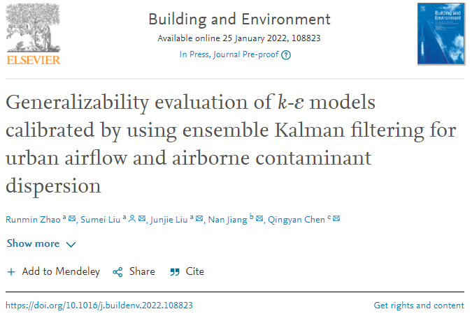 2022年1月,土木工程领域一区期刊Building and Environment刊登了课题组博士生赵润民的最新成果:Generalizability evaluation of k-ε models calibrated by using ensemble Kalman filtering for urban airflow and airborne contaminant dispersion(doi:10.1016/j.buildenv.2022.108823).
