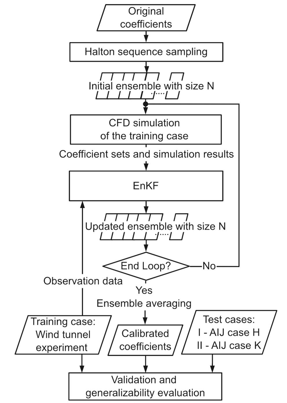 (The calibration was based on an EnKF loop that iteratively updated the model coefficients determined from the discrepancy between CFD results and observation data from a wind tunnel experiment.)