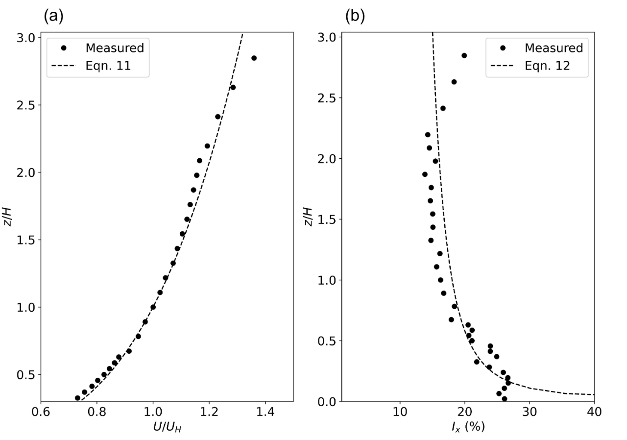 Figure 2 Profiles of (a) velocity and (b) turbulence intensity of the formulated ABL flow for the wind-tunnel