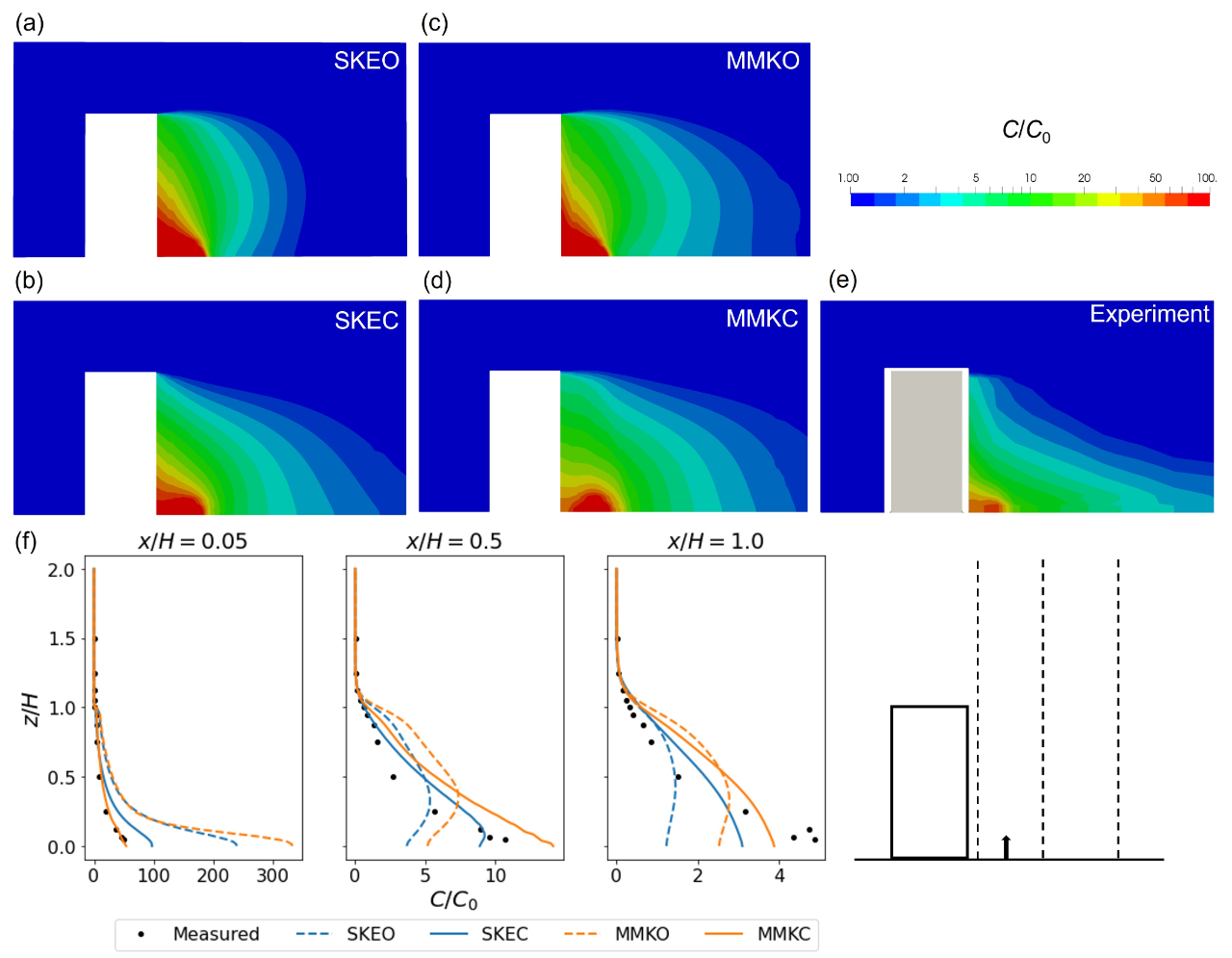 (e) determined experimentally (remade from the database [52]), and (f) vertical profiles of normalized tracer-gas