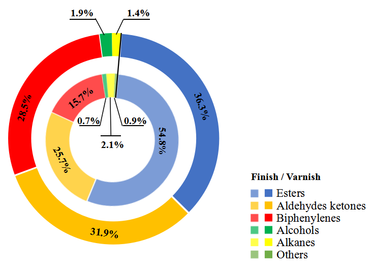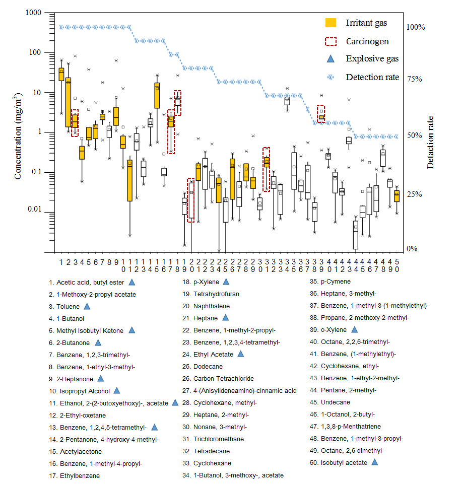 飞机喷涂车间检测到约50种挥发性有机化合物(检出率>50%),其中酯类占36.3%,醛酮占31.9%,联苯占28.5%,