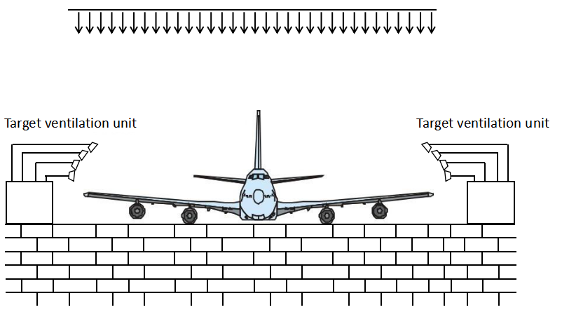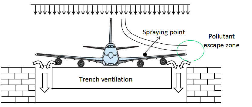 有效控制漆雾污染并使排放气体符合当地环保指标是各喷涂行业关切的问题。通常,适当加大通风和污染源控制是喷漆行业解决漆雾污染的两个主要策略。但对于高大空间飞机喷涂厂房来说并不能解决实地问题。有学者研究表明,在高大厂房内一味地加大通风量不能保证良好的通风效率,同时带来了巨大的能源浪费。而采用局部排气通风装置对于污染源进行控制,通常会妨碍飞机喷涂工人的操作。因此,需要对高大空间飞机喷涂厂房提出合适的通风和净化方法。