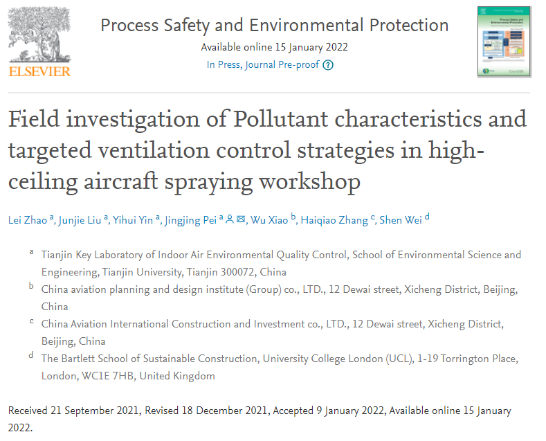 Lei Zhao, Junjie Liu, Yihui Yin, Jingjing Pei*, Wu Xiao, Haiqiao Zhang, Shen Wei. Field investigation of Pollutant characteristics and targeted ventilation control strategies in high-ceiling aircraft spraying workshop. PROCESS SAF ENVIRON. Available online 15 January 2022