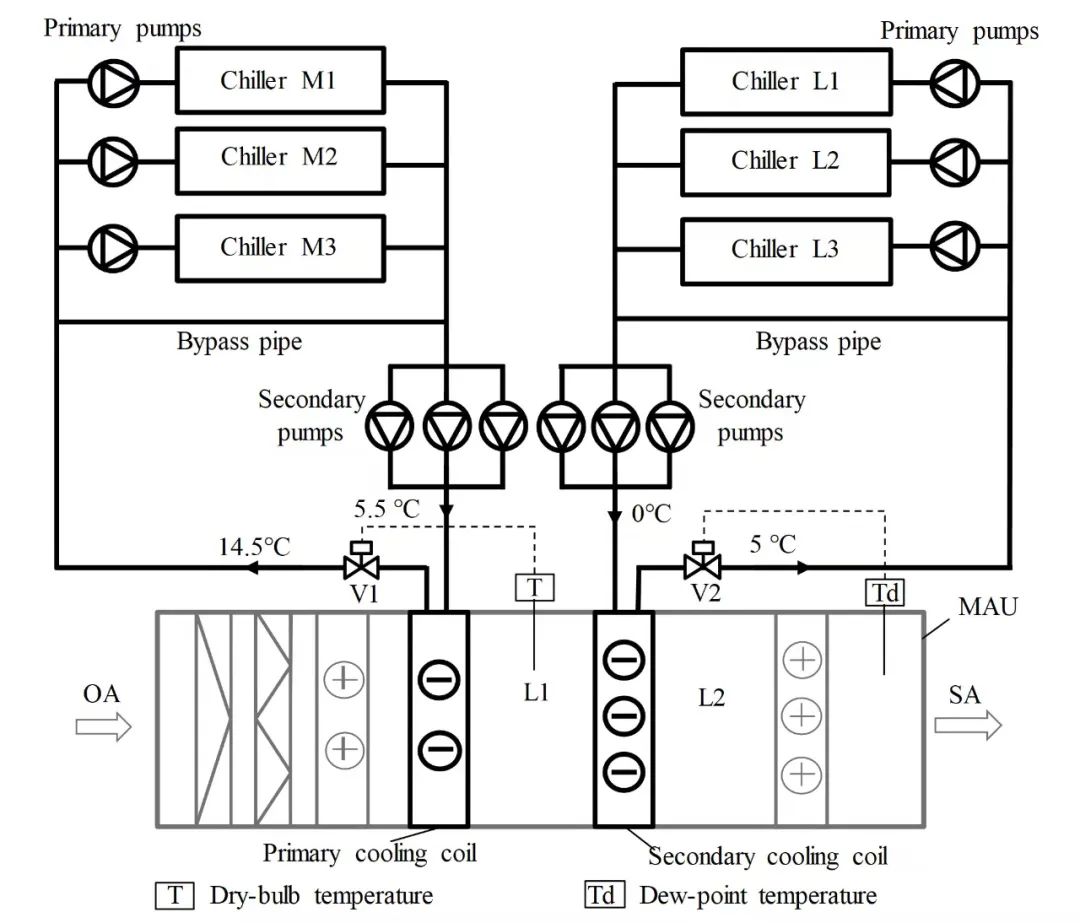 建筑占全球能源消耗的40%左右,在建筑能耗中50%以上的能耗用于建筑室内热湿环境营造。双温度冷源系统是采用高温和低温冷源分别进行温度和湿度进行控制的高效冷源系统。其中高温冷源用于承担室内的显热负荷和部分新风负荷,低温冷源用于承担新风负荷及室内全部的湿负荷。传统采用单一温度冷源系统进行热湿耦合处理,难以实现温度和湿度的同时控制,并存在能源品位的浪费。双温度冷源温湿度独立控制空调系统较传统单温度冷源系统相比,室内无湿表面防止细菌滋生,减少空调再热的造成的冷热抵消,同时高温冷源具有较高的能源效率。对于温度和湿度控制要求较高的电子洁净厂房、制药厂房、实验室等场合,双温度冷源系统是维持室内空气品质和降低能耗的一种有效解决方案。尽管双温度冷源系统比典型的单温冷源系具有较高的节能性,但目前很少有研究优化双温冷源系统冷负荷分配。对于新风处理用双温度冷源系统,一次表冷器出口空气状态决定了两组冷机的冷负荷分配。目前,多采用固定一次表冷器出口空气温度的方法实现对高温和低温冷水机组之间冷量的分配。随着室外温度的动态变化一次表冷器的出口空气状态随之变化,而固定出口空气温度设定值可能会导致部分能源品位的浪费。因此,本文以冷机的负载量及一次表冷器出口温度为决策变量,建立了冷源系统能耗最小的多参数非线性优化控制目标函数,并结合空气侧处理过程给出了一次表冷器出口空气状态的动态约束条件。在以上优化问题数学描述的基础上提出了两种双温冷源系统冷负荷分配的最优控制方法,并评估了两种优化控制方法在整个制冷季的节能效果。方法一通过调整每台冷水机组的负载量来优化每组冷机的冷负荷分配。应用方法一可以实现整个制冷季的冷机耗电量降低10.1%。方法二在室外环境条件变化时通过同时调整每个冷水机组负载量和一次表冷器出口空气温度设定值实现对同一组冷机之间和两组冷机之间的冷负荷分配。通过同时考虑冷冻水回路和空气处理过程的影响,方法二在整个制冷季实现了更高的节能率,约为16.4%。在炎热的夏季,节能主要来自于优化每个冷水机组中冷机之间的冷负荷分配,这种优化方法对总节能量的贡献率达到了63-68%。在温和的月份,优化同一组冷水机组之内和优化两个冷水机组之间的冷负荷分配对总节能量的贡献率几乎相同,约为50%。从以上研究结果可以看出本文所提出的优化控制方法能够进一步提升双温度冷源系统的运行效率。所提出的优化控制方法为双温度冷源系统在电子洁净厂房、制药厂房、实验室等场合的应用提供的技术参考和支持。