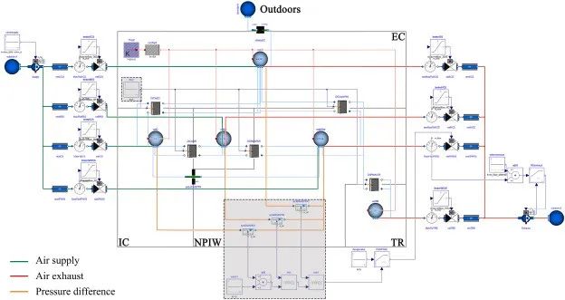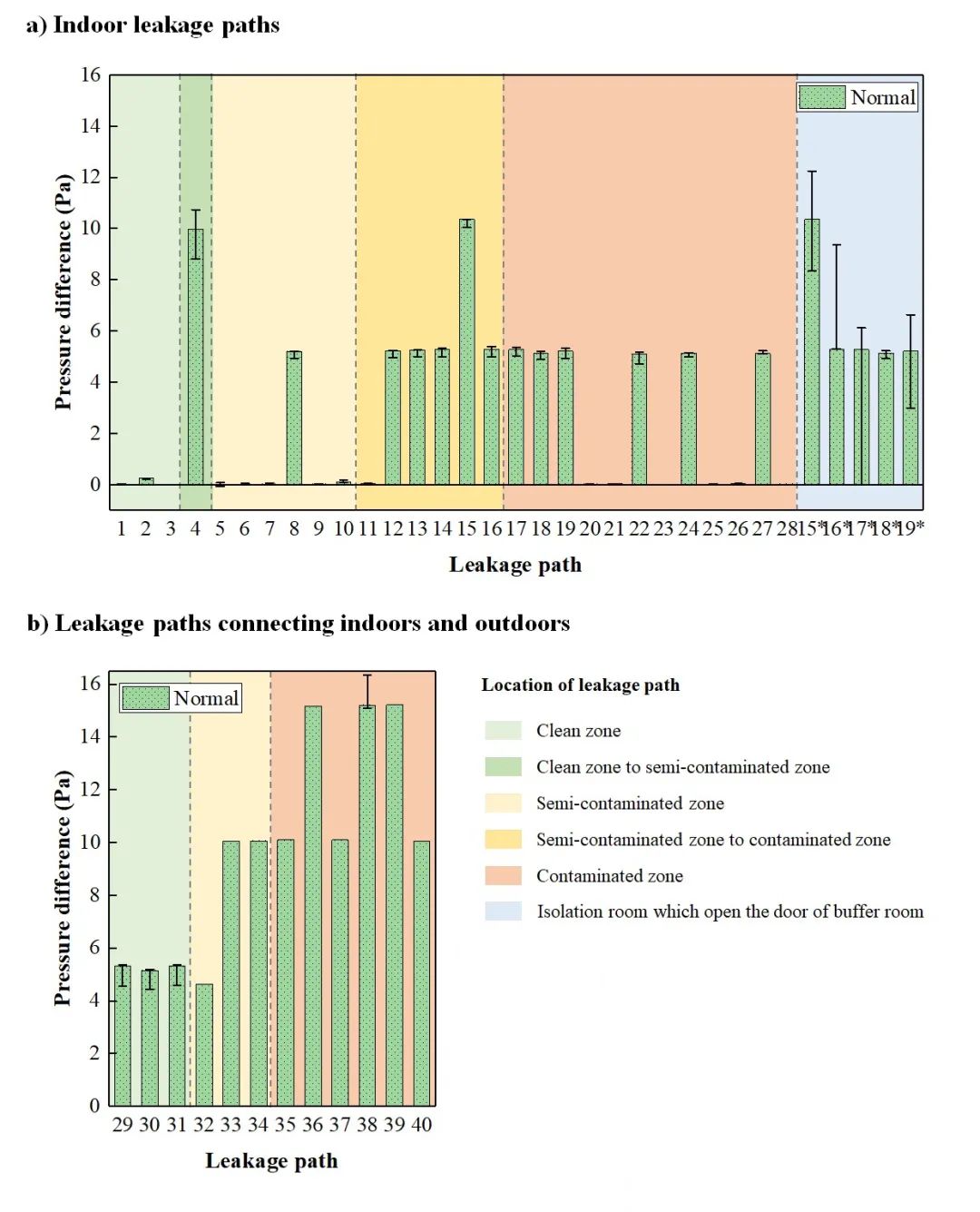 传染病医院内房间被划分为不同的污染等级区,通过保持区域间一定的压差值来引导气流流向污染区,从而避免空气中的病原体扩散至整个医院。但在动态情况下该压差值很难保持,尤其是当隔离室的门打开时。目前国内外规范仍然缺少面对这种压差不保持情况的应对指导。实际上,现在的传染病医院设计时,在负压隔离病房的排风口处会设置变风量调节阀,尝试通过VAV系统实现主动压差控制,但由于对其可控性缺乏信心,它通常按照CAV系统运行。本研究基于真实的传染医院,应用Modelica语言建立并验证了医院的多区模型。通过对单一隔离室的模型(包含缓冲间、负压隔离病房和卫生间)进行模拟,探究了一种适用于负压隔离病房的VAV主动压差控制策略,并将该策略应用于整层的医院模型中,分析了VAV系统运作对多房间之间压差的影响。研究结果表明,采用此控制策略可使隔离室内不同泄漏路径的压差偏离降低9.98%-25.73%。在常见的动态情况下,VAV系统运作时整个医院内房间之间压差是稳定的。此外,不同污染等级区之间的门及与室外相通的窗的气密性需要降低,以此增强它们两侧压差的抗干扰能力。本研究填补了传染病医院相关规范的空白,为传染病医院内应用VAV系统实现主动压差控制提供了参考。