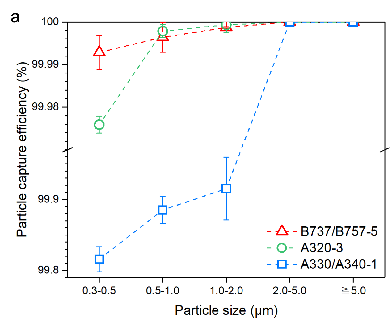 图5. 用于客机座舱的(a)一些典型过滤器和(b)全部HEPA过滤器的颗粒物过滤效率。