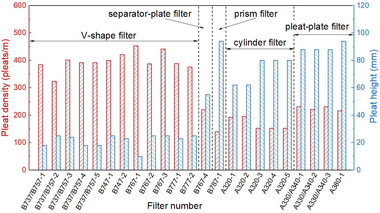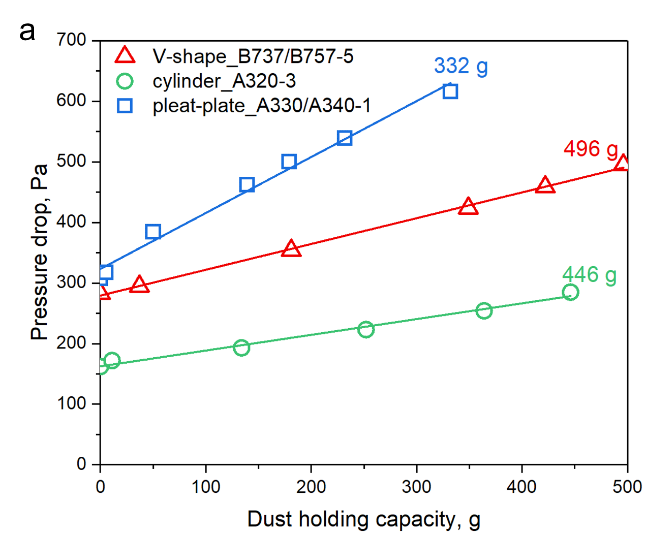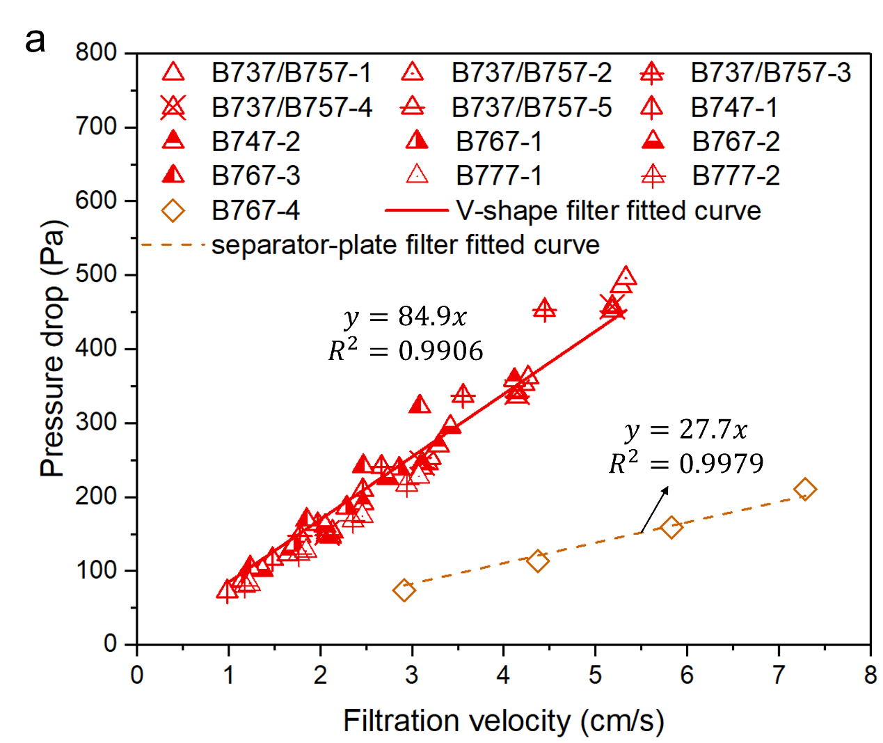 • 大型客机座舱HEPA过滤器的压降在84.7 Pa/(cm/s)左右,容尘量在32.2–37.0 g/㎡。