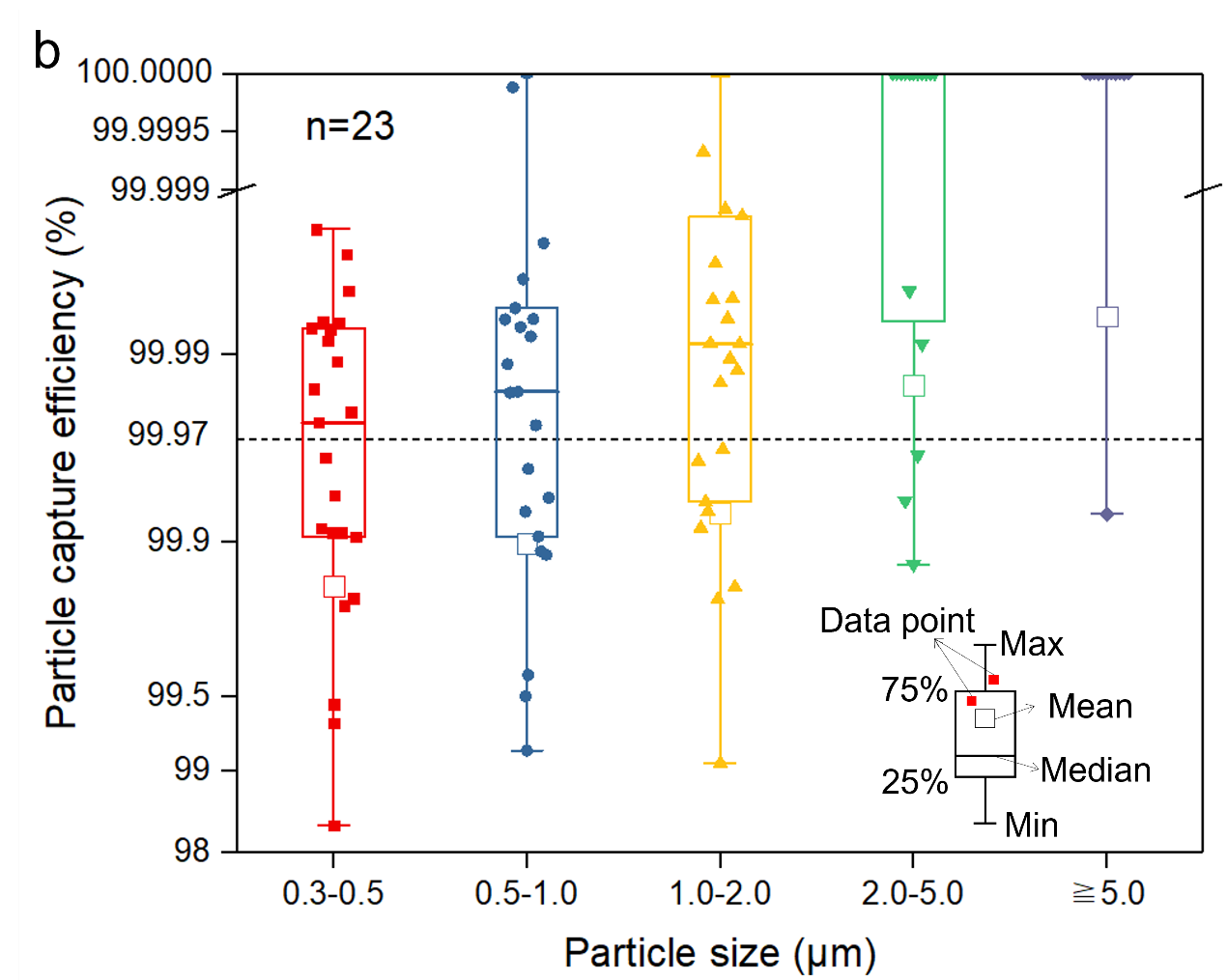 • 所有测试过滤器对0.3~0.5 μm颗粒物的过滤效率中值超过99.97%,最高达到99.998%;