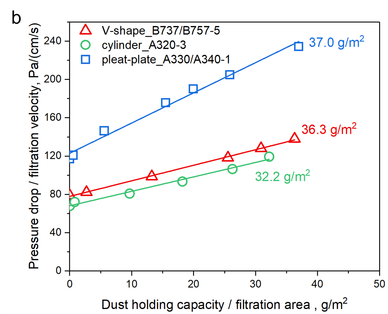 图6. 客机座舱HEPA过滤器的容尘量:(a)容尘量-压降曲线和(b)标准化容尘量-标准化压降曲线。