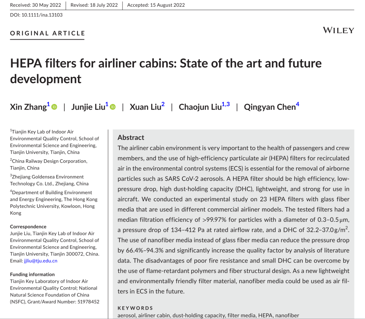 Zhang X, Liu J, Liu X, Liu C, Chen Q. HEPA filters for airliner cabins: State of the art and future development. Indoor Air. 2022;32:e13103. https://doi.org/10.1111/ina.13103.