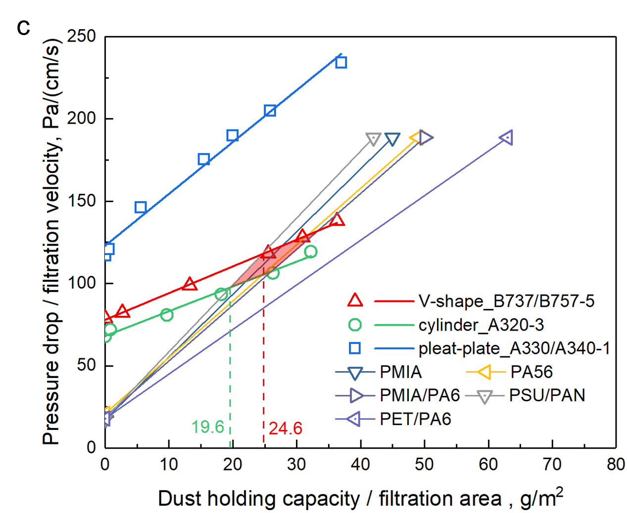 • 对于同样结构的过滤器,在效率接近的情况下,通过改善滤料性能可以显著降低阻力。