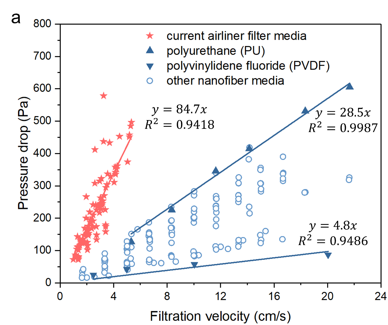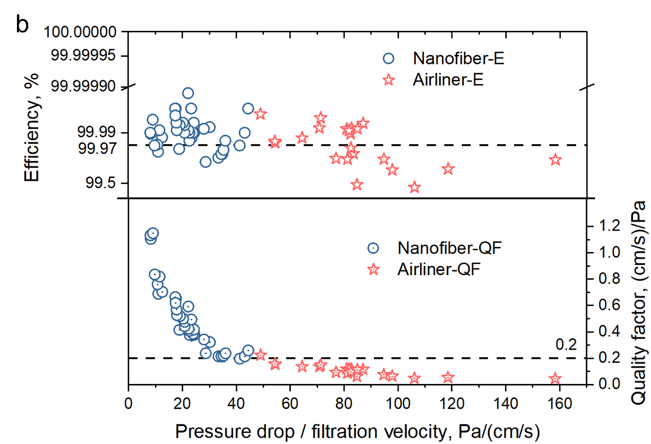 • 高效纳米纤维滤料的阻力在4.8~28.5 Pa/(cm/s)之间,远低于座舱HEPA过滤器的84.7 Pa/(cm/s),使用纳米纤维滤料可以降阻66.4% ~ 94.3%,品质因子提升5倍;