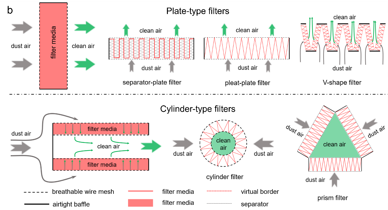 图1. 不同结构的客机座舱HEPA过滤器样品(a)及流向示意图(b)。
