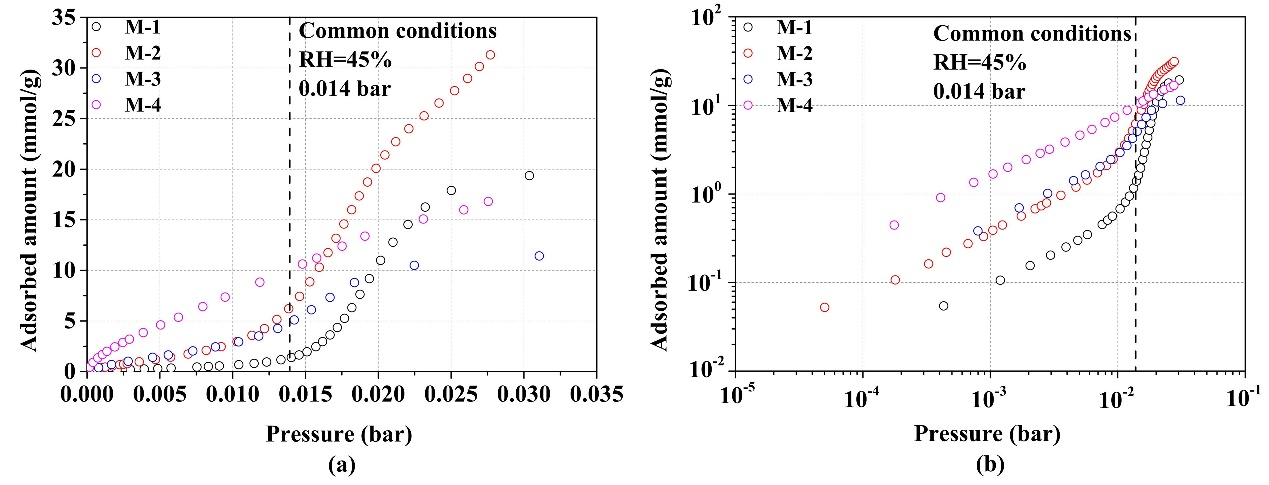 在接近0.030 bar时,水蒸气的吸附量遵循以下顺序:M-2 (31.30 mmol/g) > M-1 (19.37 mmol/g) > M-4 (16.82 mmol/g) > M-3 (11.43 mmol/g)。
