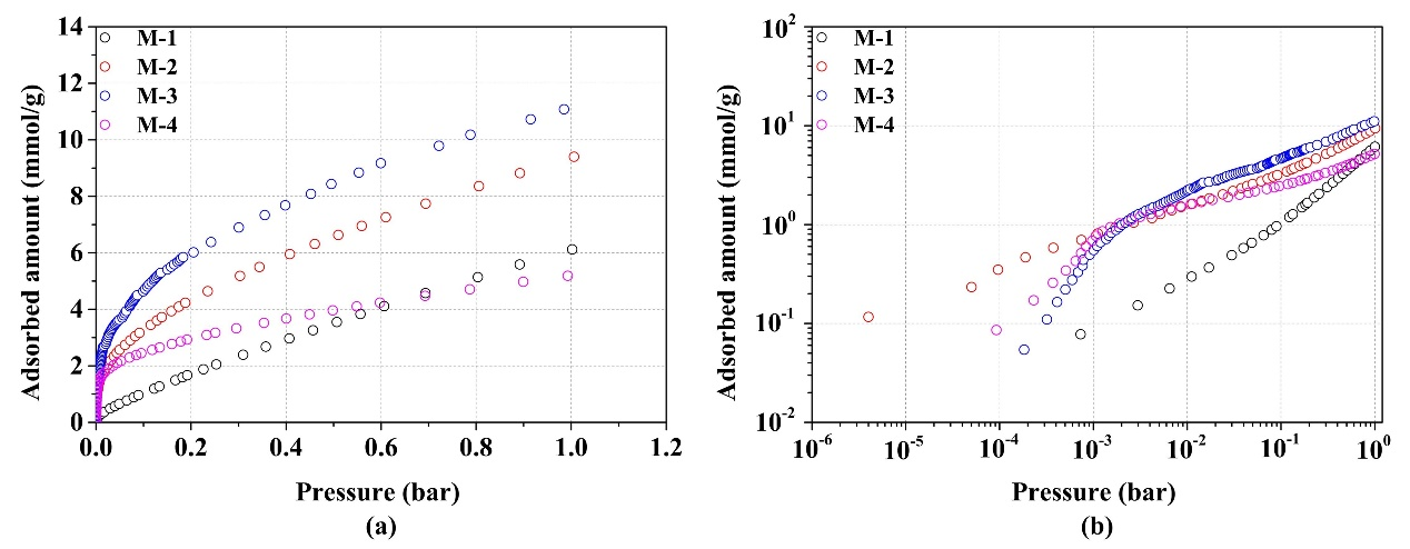 在接近1.0 bar时, 氨气的吸附量遵循以下顺序:M-3 (11.08 mmol/g) > M-2 (9.40 mmol/g) > M-1 (6.13 mmol/g) > M-4 (5.19 mmol/g)。