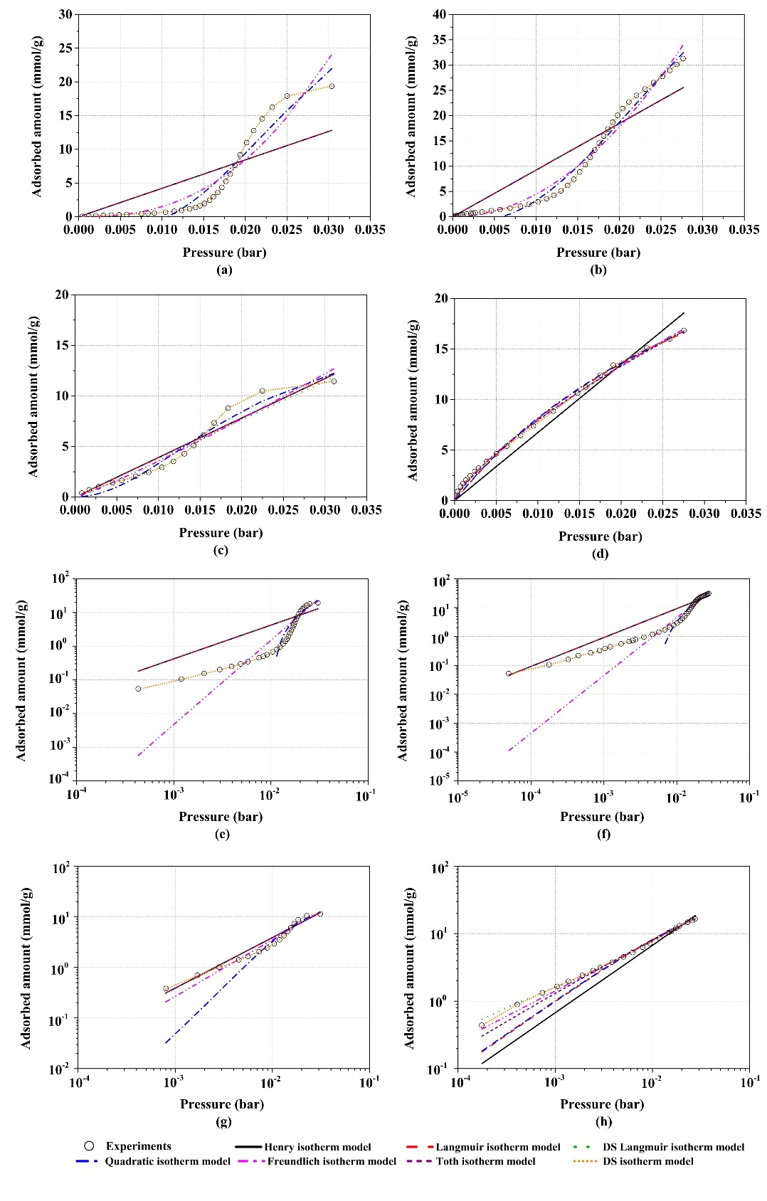 图3.在298 K时,298K下活性炭吸附氨气的等温线模型:线性坐标下的图为(a) M-1,(b) M-2,(c) M-3和(d) M-4和对数坐标下的图为(e) M-1,(f) M-2,(g) M-3和(h) M-4