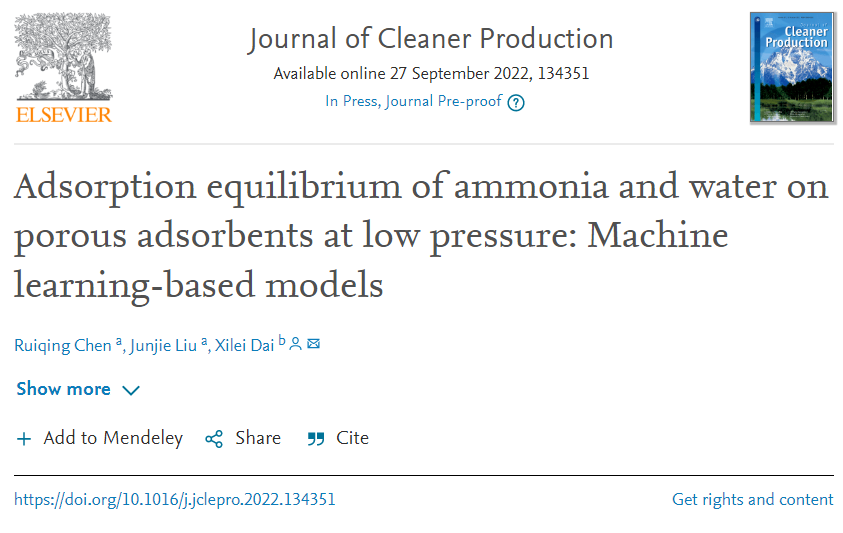 课题组陈瑞清博士在中科院一区期刊《Journal of Cleaner Production》(JCR Q1, IF=11.072)发表了基于机器学习模型对低压下多孔吸附剂上氨气和水蒸气的吸附平衡的研究。