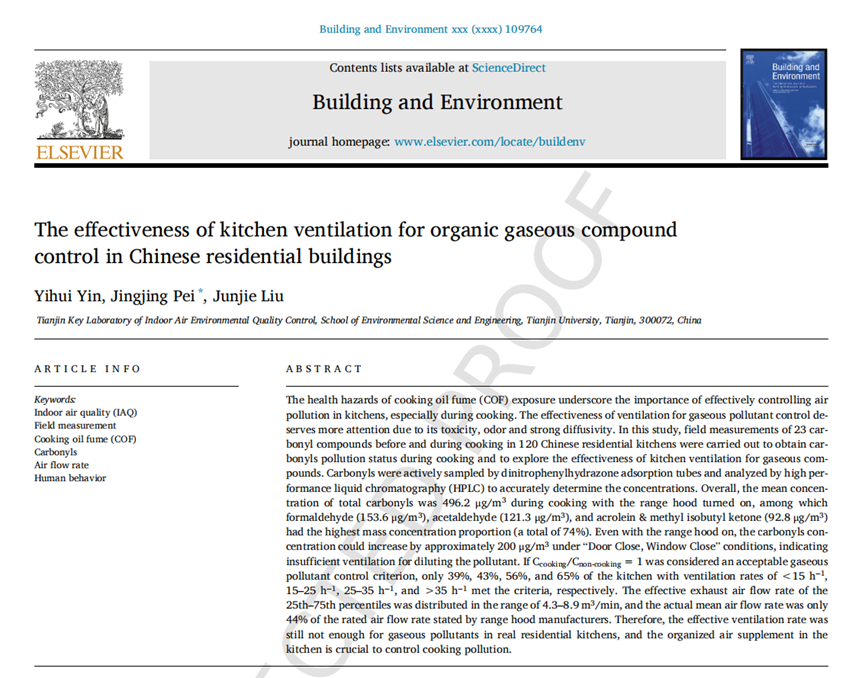 2022年11月,课题组尹奕卉博士在工程技术1区TOP期刊《Building and Environment》(影响因子IF:7.093)上发表了最新研究成果:The effectiveness of kitchen ventilation for organic gaseous compound control in Chinese residential buildings(https://doi.org/10.1016/j.buildenv.2022.109764),该研究由国家十三五重点研发计划项目“居住建筑室内通风策略与室内空气质量营造”(2016YFC0700500)资助。