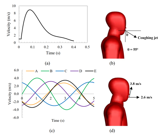 Fig. 2. The fluid boundary conditions: (a) coughing velocity produced by the infected person [43]; (b) the coughing jet direction, there was a downward angle based on Gupta et al. [43]; (c) the air velocity of asynchronous breathing distributions [42] assigned at the nose of each person. For subsequent times, it was assumed that breathing would fluctuate periodically; (d) coughing velocity with wearing a mask.