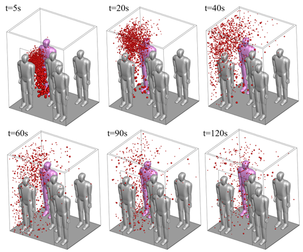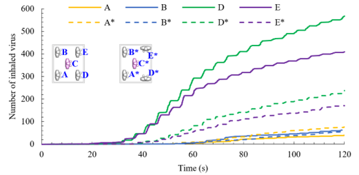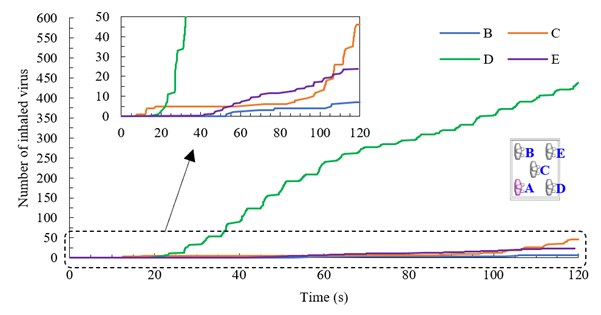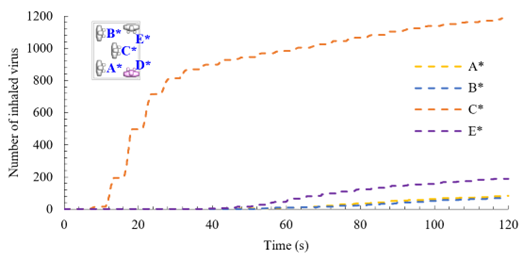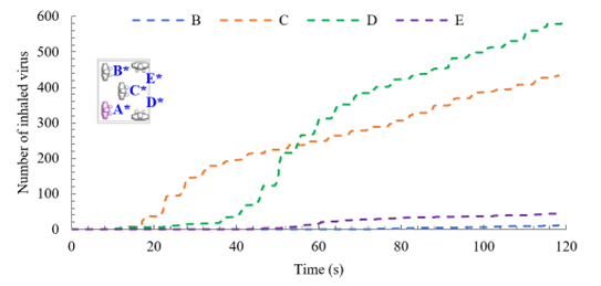 · For the baseline base, the virus particles reached the breathing zone of person D at 20 seconds. This person inhaled 438 virus copies during a two-minute elevator ride, which could result in infection. On the other hand, the number of virus copies inhaled by the remaining three persons was less than 50, which may not lead to infection.