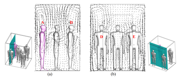Fig. 8. Velocity distributions in the elevator of Case 1 at t = 120 s: (a) airflow in the surface across infected person A and person D, (b) airflow in the surface across persons D and E.