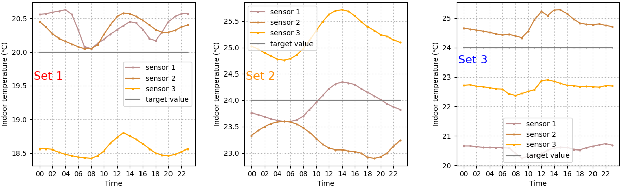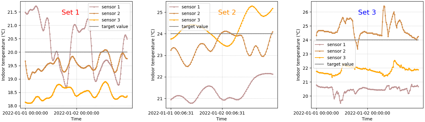 从每个数据集中提取三个室内温度采集器的部分数据进行观察,如图5所示。结果表明,室内温度不仅受共同因素(天气条件、换热站控制参数)的影响,还受建筑围护结构和热用户活动等更多独立因素的影响。