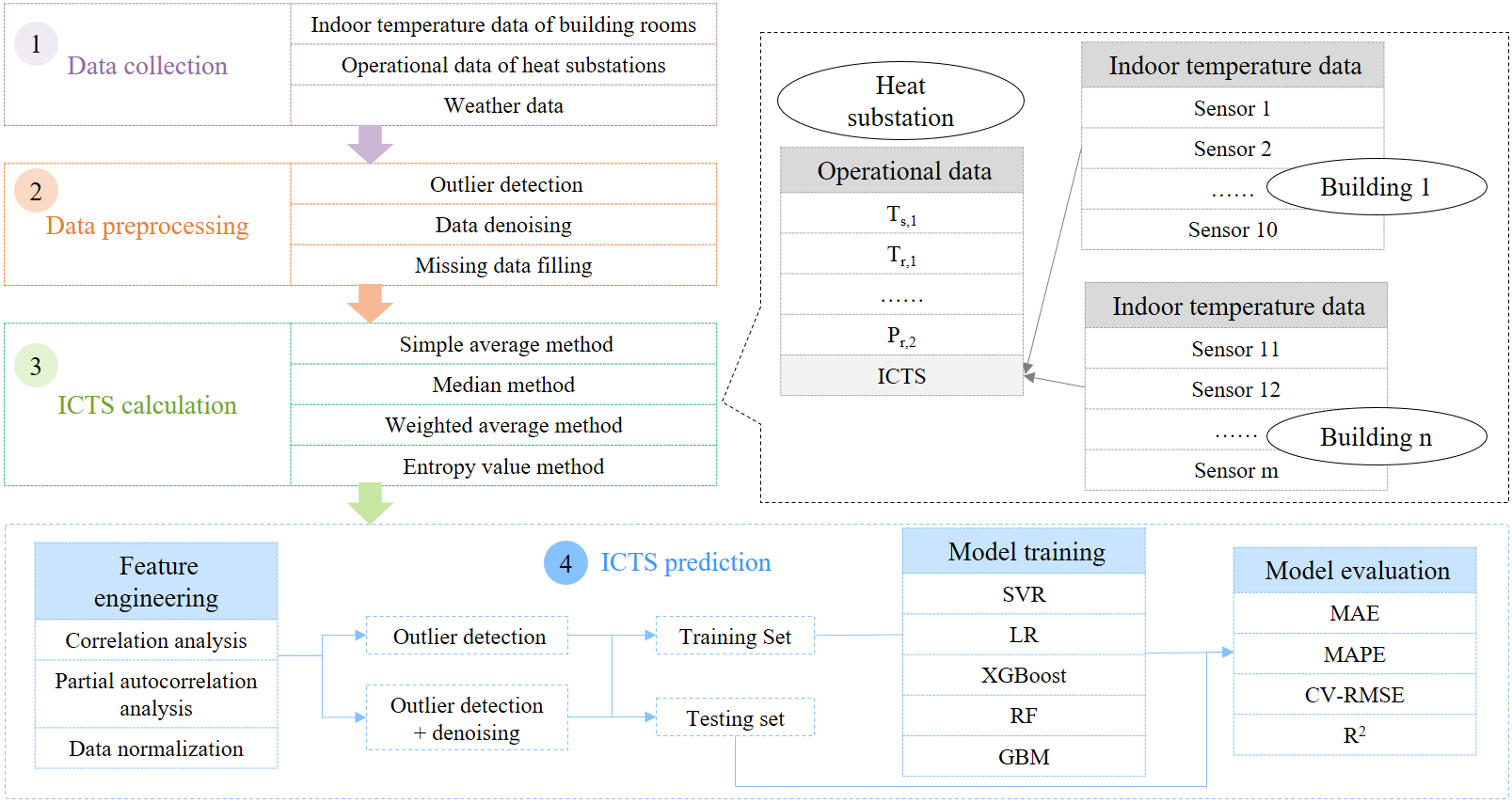 本研究的处理流程分为四个步骤:(1)从三个实际的集中供热系统收集了原始数据。(2)对原始数据进行预处理,包括异常值检测、数据去噪和缺失数据填充。(3)使用多种方法计算ICTS并进行比较。(4)选择了五个经典的算法模型对ICTS进行预测。