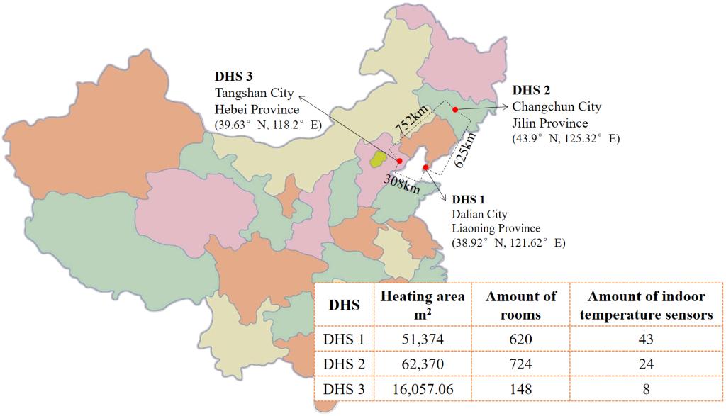 本研究选择了三个中国北方的集中供热系统作为试验场地,分别位于辽宁大连、吉林长春和河北唐山。从每个集中供热系统各选择了一个换热站作为试验对象,其供热面积、热用户数量和室温采集器数量如图3所示。
