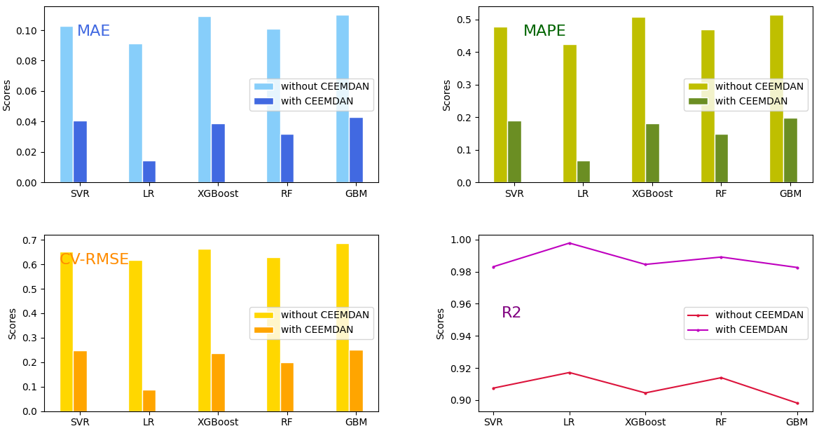 采用五个经典的算法模型对ICTS进行了预测,包括SVR、LR、XGBoost、RF和GBM。采用四种指标MAE、MAPE、CV-RMSE和R2对预测性能进行了评估。原始数据分别采用两种方法进行了预处理,第一种只采用3σ方法检测异常;第二种在3σ方法检测异常的基础上,还采用CEEMDAN方法进行了去噪。预测结果如表7所示。