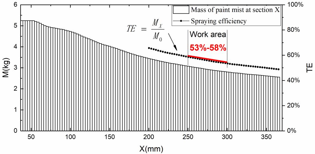 4.工作区喷涂效率经粒子逃逸后为53%-58%。