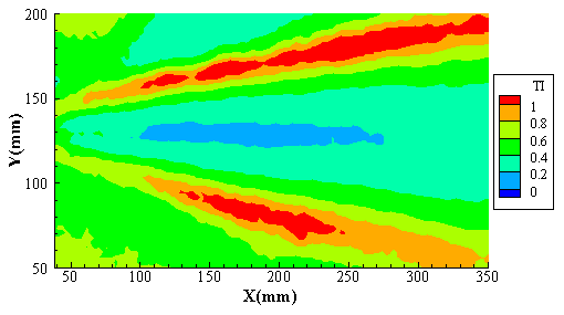 2.喷射射流的边缘区域出现强烈的湍流强度。