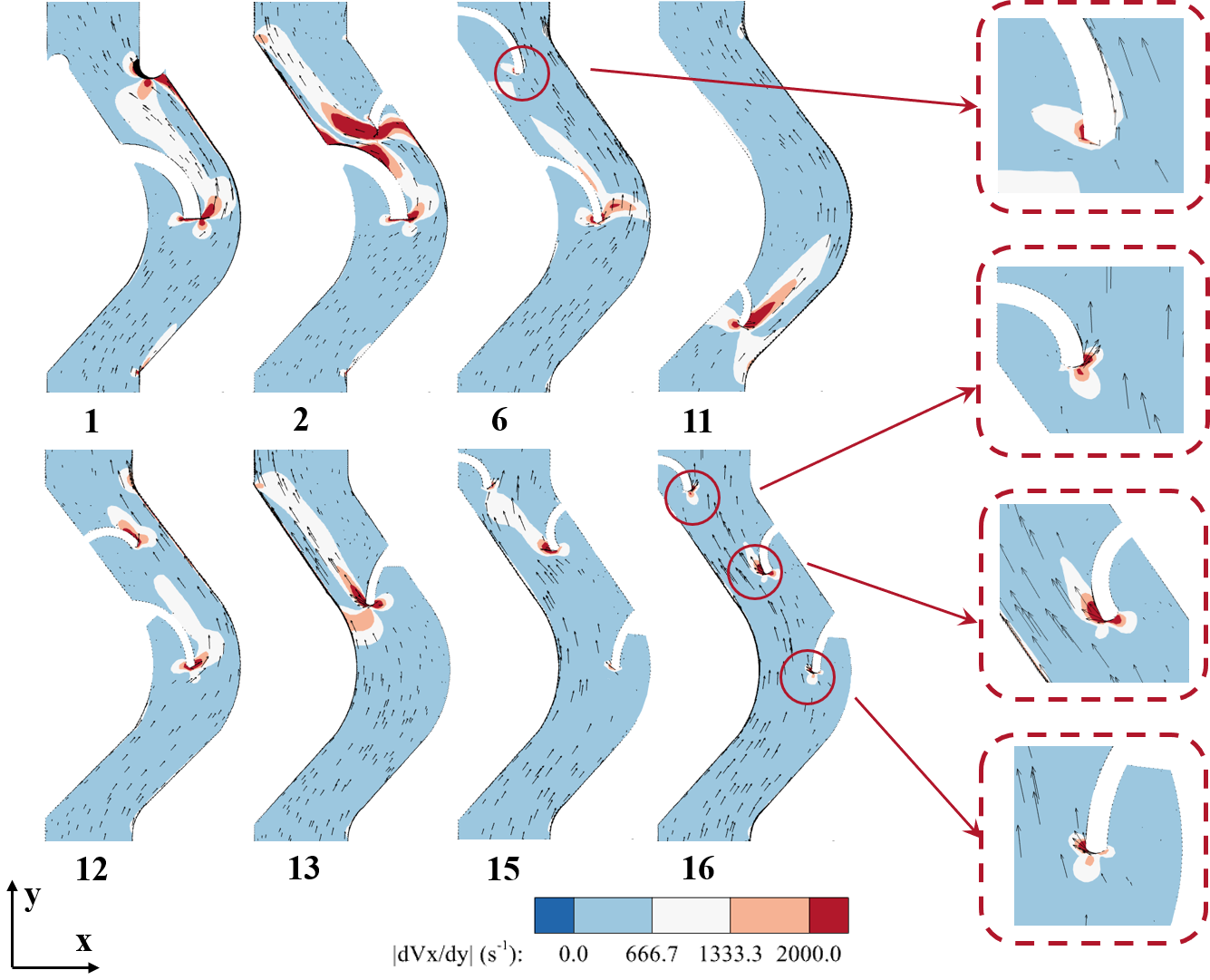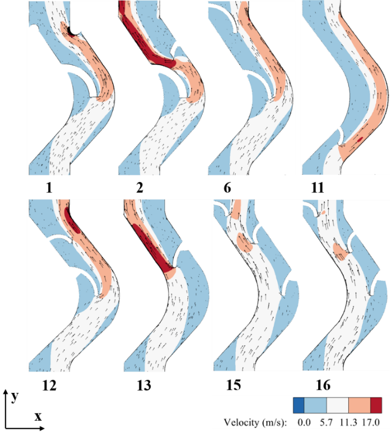 2. 图3表示了不同百叶窗结构内的气流转向剧烈程度。结合矢量图可以看出,Case16百叶窗出现了三次较强的气流转向,而Case1和Case6的气流转向次数为两次。更频繁的气流转向可以更多利用颗粒的惯性进行分离净化,因此颗粒的分离效率可能更高。