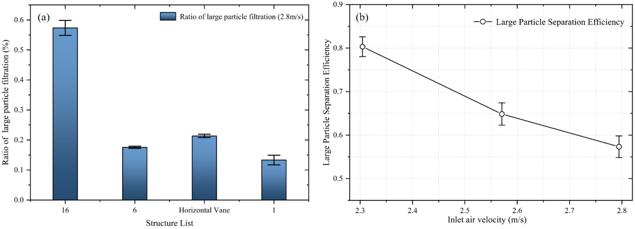 3. (图4a)Case16百叶窗的颗粒分离效率明显更高。当进气速度为 2.8 m/s 时,Case16百叶窗的分离效率为57.3%,而商用水平叶片百叶窗的分离效率为 21.4%,Case1百叶窗的分离效率最低,仅为13.3%。(图4b)Case 16百叶窗的大颗粒分离效率随着入口风速的增加而降低。当入口风速为 2.3 m/s时,大颗粒分离效率为80.3%。当入口空气速度增加到2.8 m/s时,大颗粒分离效率下降到 57.3%。