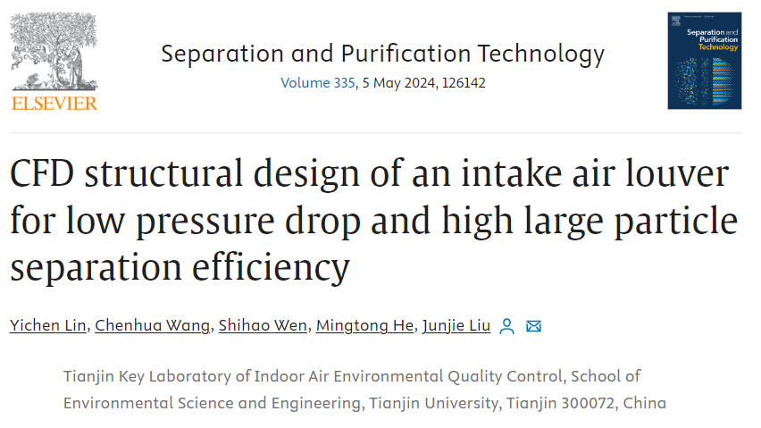 Lin Y, Wang C, Wen S, et al. CFD structural design of an intake air louver for low pressure drop and high large particle separation efficiency[J]. Separation and Purification Technology, 2023: 126142.