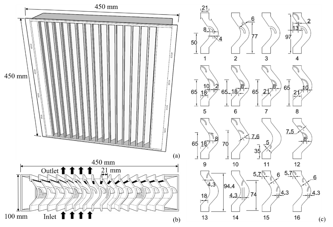 本文在实验和计算流体动力学(CFD)模型的基础上,提出了一种具有更高的颗粒分离净化效率和更低压降的新型竖向叶片百叶窗(图1)。新结构利用大颗粒通过弯曲通道的惯性分离作用,确保在气流改变方向时,大颗粒保持原来的运动方向,从而与防尘钩碰撞,造成大颗粒失去动能,并在重力作用下坠落,产生分离净化效果。此外,评估了防尘钩的位置、数量和进气速度对压降和分离效率的影响。研究结果可作为指导后续类似结构设计的参考,制定有效的控制策略,提高大颗粒分离效率的同时实现低压降。