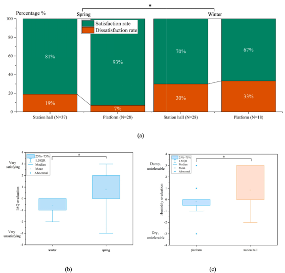 图 4 室内空气质量评价结果(a)地铁站空气不满意率结果(b)冬春两季女性对站台室内空气质量的评价(c)春季女性对站台湿度的评价(*:P < 0.05)