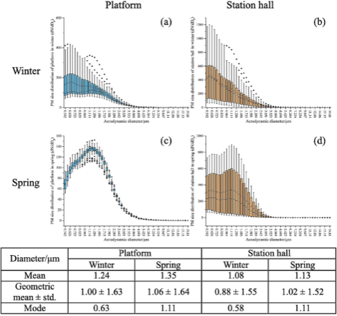 2. 站台上的 PM1/PM2.5 比率在春季明显低于冬季(P < 0.05)且与湿度呈显著负相关(P < 0.05)。