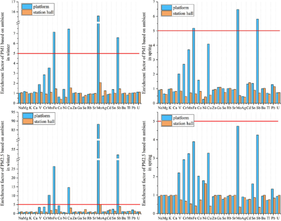3. 与冬季大气颗粒物相比,在站台上收集的 PM2.5 和 PM1 富含锰、铁、铜、钼和锑元素。锰、铁、铜、锰和锑富集因子均大于 5,都来源于地铁铁轨摩擦产生。其中钼、锑、铁元素的浓度分别是大气颗粒物的88,52,和27倍。
