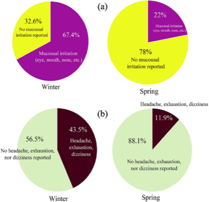 5. 没有病态建筑综合征症状的工作人员比例从春季的 82.9 %下降到冬季的25 %。最常报告的症状(≥40 %)包括口干、唇干、喉咙干和疲惫。与春季相比,冬季的相对湿度较低,PM1 和 PM2.5 的质量浓度较高。逻辑回归模型表明,相对湿度(P < 0.01,回归系数:-2.466)和 PM2.5(P < 0.05,回归系数:3.48)对病态建筑综合征症状发生概率有显著影响,这意味着湿度较低和 PM2.5 质量浓度较高可能与病态建筑综合征症发生概率较高有关。