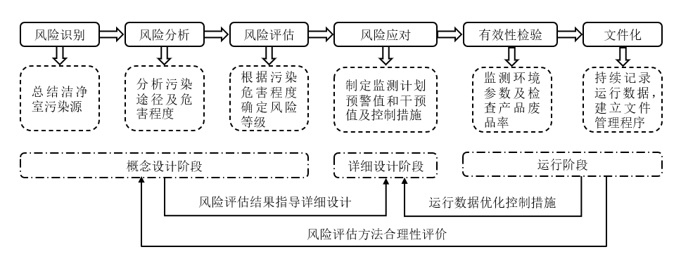 。本文借鉴HACCP的评估方法对洁净室污染进行风险评估,总结制药洁净室在概念设计阶段、详细设计阶段、运行阶段采用HACCP风险评估法的实施步骤,如图1所示。