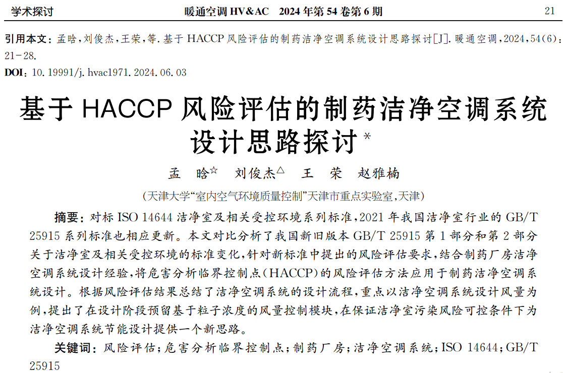 “室内空气环境质量控制”天津市重点实验室建造环境(BERL)课题组孟晗博士在《暖通空调》期刊发表论文,基于HACCP风险评估的制药洁净空调系统设计思路探讨。